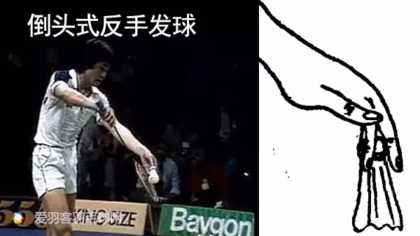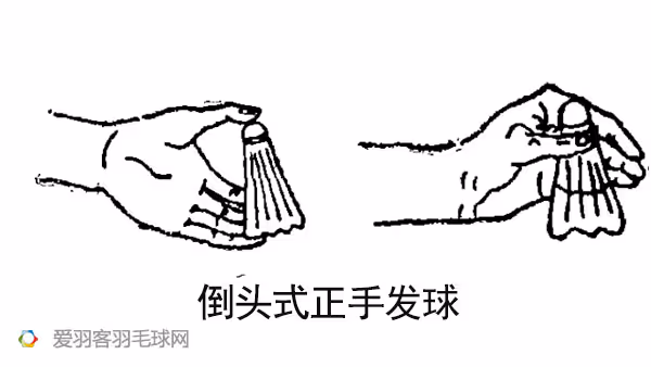 发球前将球倒头持于手中,即球托在上,羽毛开口朝下,拍面切击右侧羽毛的同时切球托,球按逆时针方向旋转前进。这样发球旋转速度较快,升至最高点后有急速下栽和左拐弯的特性,比赛中不易被对手扑球。
