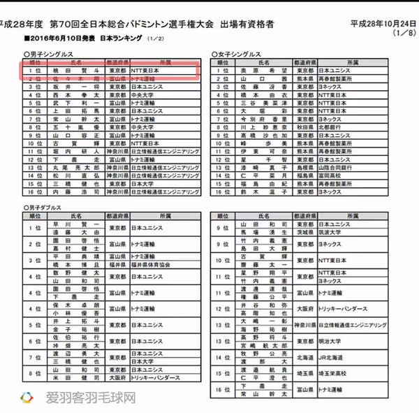 另外,日本羽毛球联赛将于11月28号至12月4号之间举行,据参赛名单显示,桃田贤斗将代表NTT东日本俱乐部出战。