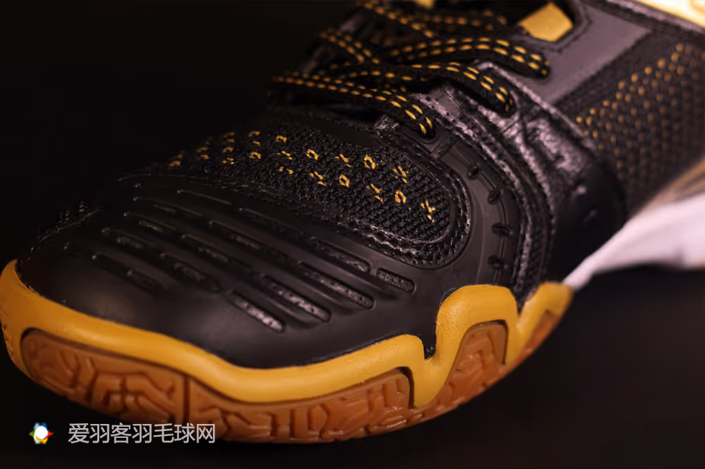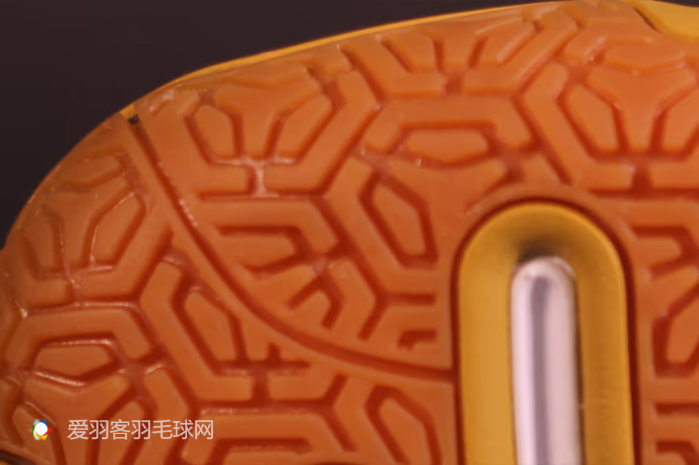 在前脚掌外侧靠近足弓的位置,是羽毛球鞋在跑动中最容易变形的位置,AYAM007的一体成型大底在这个位置向上沿伸,起到了防侧翻的作用,能够有效增强球鞋的稳定。