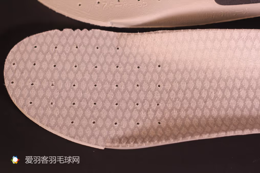 贴地飞行的鞋垫上布满了菱形的纹路,用来增强袜子和鞋垫间的摩擦,进一步避免脚在鞋内打滑,鞋垫的前端厚度接近六毫米,在前掌部分有方形排列的透气孔,使用中的舒适度不错。