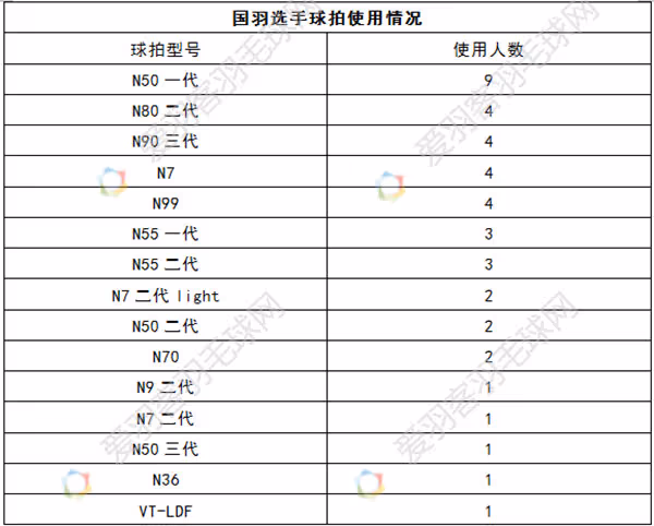 从上面的表中可以看到,在国羽队员装备的球拍当中,N50一代、N99、N80二代出现的频率都比较高,此外还有多款N系类早年的球拍也仍然活跃在队员当中。