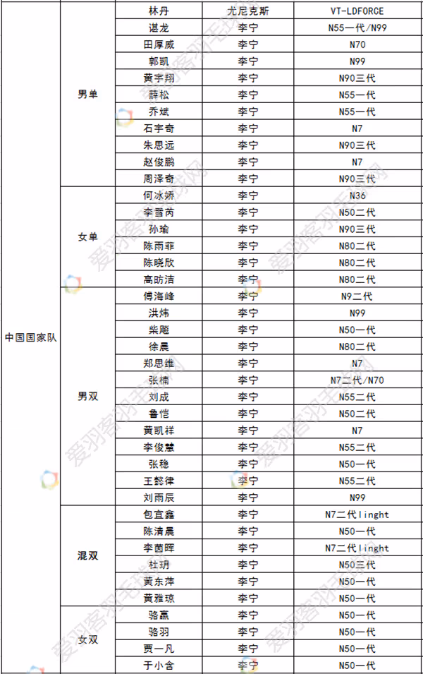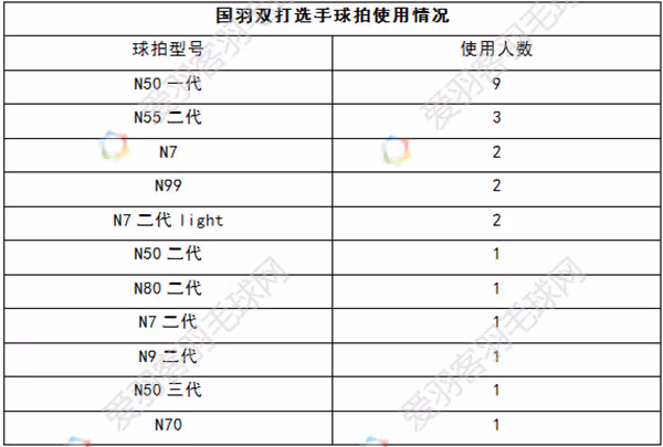 我们统计的双打选手共计23位,而上面提到的N50一代的使用者们也清一色都在这23位双打选手当中,9位使用N50一代的国羽队员当中更有7位皆是女选手,这么看来,N50一代对于双打可谓是一支神器,国羽女双混双几乎人人都用过,连赵芸蕾当你出道也是手持N50一代。
