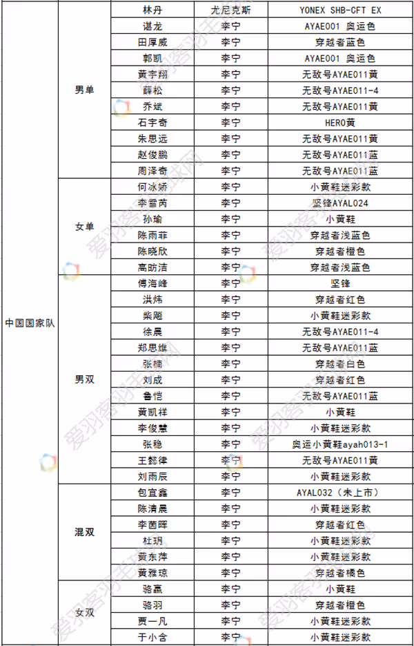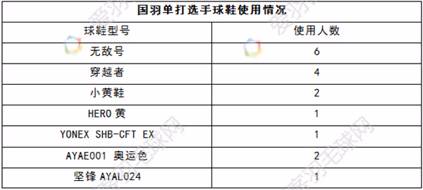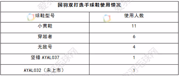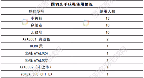 40位国羽队员,穿着小黄鞋、无敌号、穿越者这三款球鞋的就有33位,可以说是很强势了。