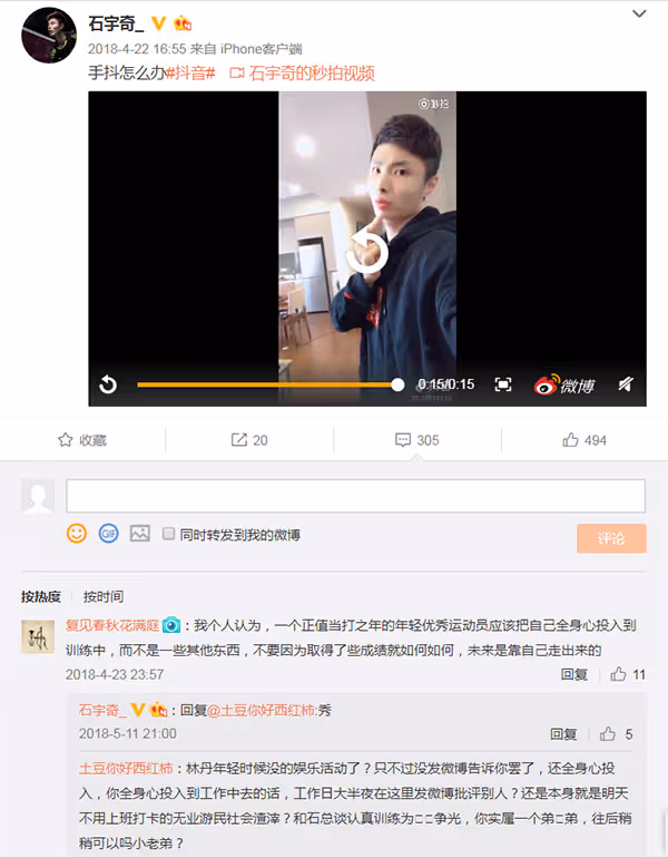石宇奇喜欢玩抖音,而且拍抖音的技术也是相当不错,吸粉无数的他,起初由于输给桃田贤斗而遭到很多批评的声音,也不乏一些被网友辱骂。
