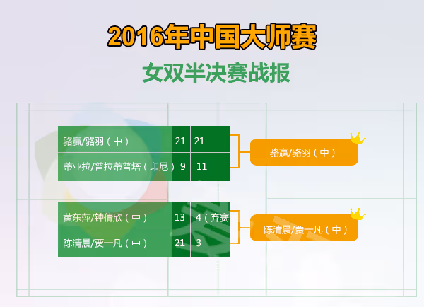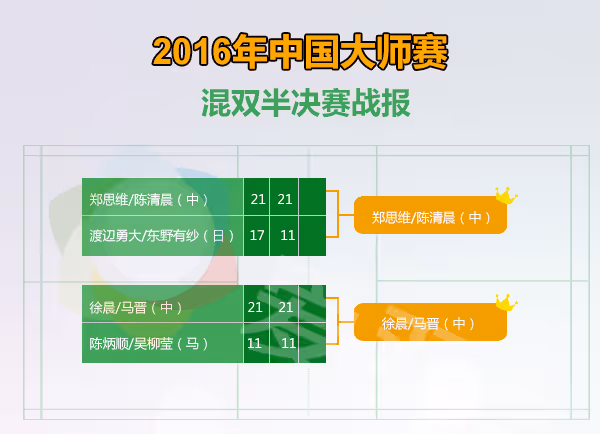爱羽客羽毛球网4月23日讯,2016年中国羽毛球大师赛半决赛于今天下午全部结束。在今天的比赛中,国羽在男单、女单、女双、混双四个项目中提前锁定了冠军。而男双项目的冠亚军则被韩国提前锁定。