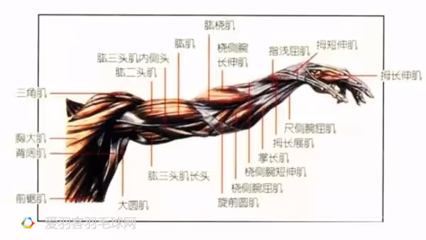 3.相对粗大的肱二头肌和肱三头肌发力只和手腕肌肉差不多。