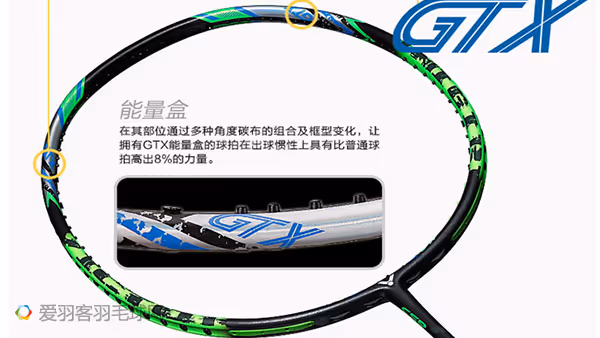 在其部位通过多种角度碳布的组合及框型变化,让拥有GTX能量盒的球拍在出球惯性上具有比普通球拍高出8%的力量。