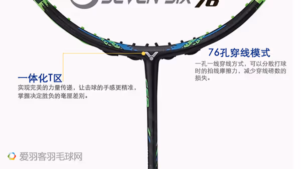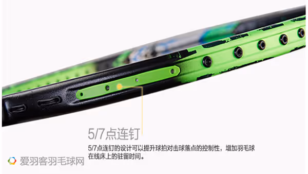 5/7点连钉的设计可以提升球拍对击球落点的控制性,增加羽毛球在线床上的驻留时间。