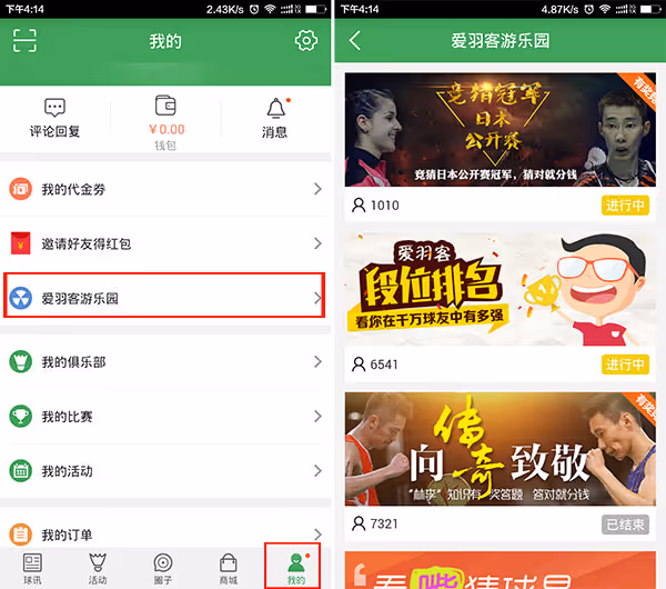 2.进入爱羽客APP并登陆,点击“我的”—“爱羽客游乐园”即可参加活动。