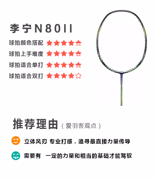 高远球:用N80Ⅱ打高远球感觉手感单一,有一种硬碰硬的感觉,你能发多少力,球就能飞多远。N80Ⅱ对于使用者的架拍姿势和发力准确性都有比较高的要求,击打声音很脆,但是不会震手,出球直接清脆,丝毫不拖泥带水,挥拍、发力、触球、出球一气呵成。对于喜欢借力的爱好者来说,可能感觉高球比较费力。但是当你习惯后,你会慢慢喜欢这种准确发力、准确收放的打感,精准的落点就需要这种接近百分百的控制才能实现。
