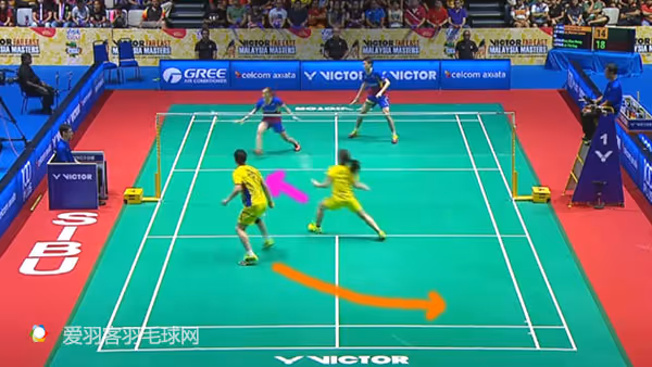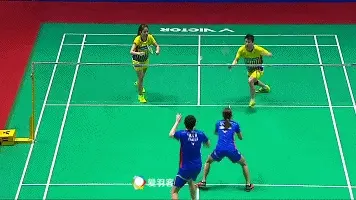 当混双男女平行站位时,女队员通过接杀分球+跟进,形成前后的轮转是摆脱被动防守的一个常用套路。这种情况女队员尽量要走,哪怕有一定风险,也不要一直留在后场挨打。