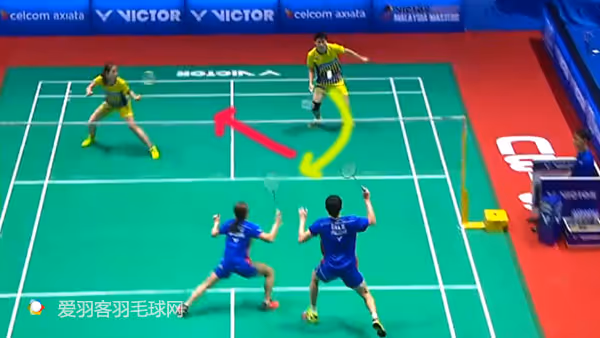女队员分球后,追封直线是一个混双的常见的球路,这种情况都要坚决的移动。哪怕是没有打到球,也发挥了作用。能够封堵直线线路(如果漏过去,正好是自己搭档的反手后场),同时可以逼迫对手转斜线,增加对手回球的难度。