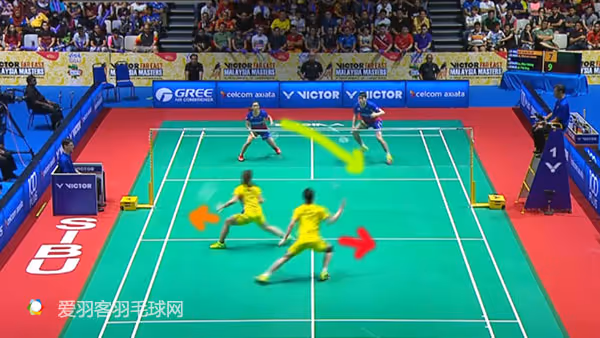(黄衣女强行上斜线挡网,造成黄衣男的轮转被动)