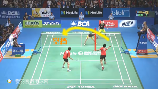 (红衣男抢网,在黑衣组合左半场形成前后站位时突然转斜线空档)
