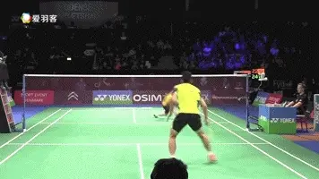 据爱羽客菜师兄观察,不管是退正手区还是退头顶区,伟哥在最快的情况下都能通过“一转一跳”从前发球线附近退到后场底线。比一般情况下的后退明显少了一个过渡性的垫步(如后交叉)。在类似的后退距离区间,之所以能够省掉过渡性的垫步,其关键在于转身后通过单腿起跳飞跃了一大段距离。