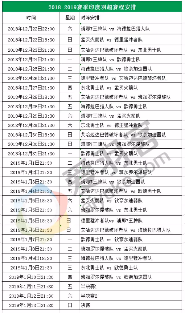 北京时间2019年1月8日晚21:30,印度羽毛球超级联赛将进行班加罗尔爆破队对阵孟买火箭队的比赛。李龙大、斯里坎特、亨德拉等选手有望出场。