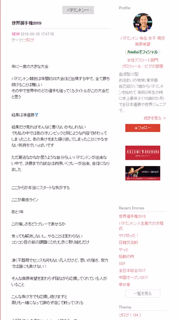 2019年巴塞尔世锦赛早已结束,在女单决赛上,奥原希望两局脆败辛德胡摘得银牌。昨天,奥原希望在个人社交平台发布了一篇很长的类似散文诗的文章,表达了自己无畏世锦赛失利,力争变得更好的决心和夙愿。