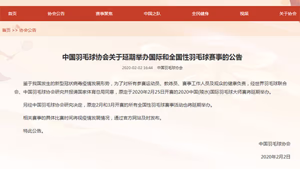 该公告《关于延期举办国际和全国性羽毛球赛事的公告》表示:
