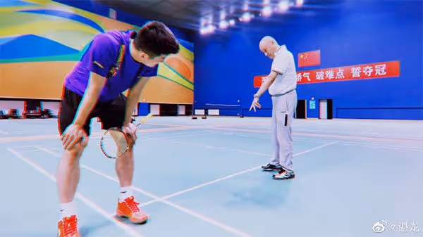 谌龙则晒出了自己在羽毛球馆里与李矛教练一起训练的照片。