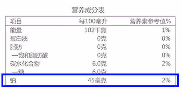 根据国家标准,运动饮料的钠含量应在 5~120 毫克 / 100 毫升。选购时,我们可以查看饮料的「营养成分表」中,钠含量的数值是否在范围内。