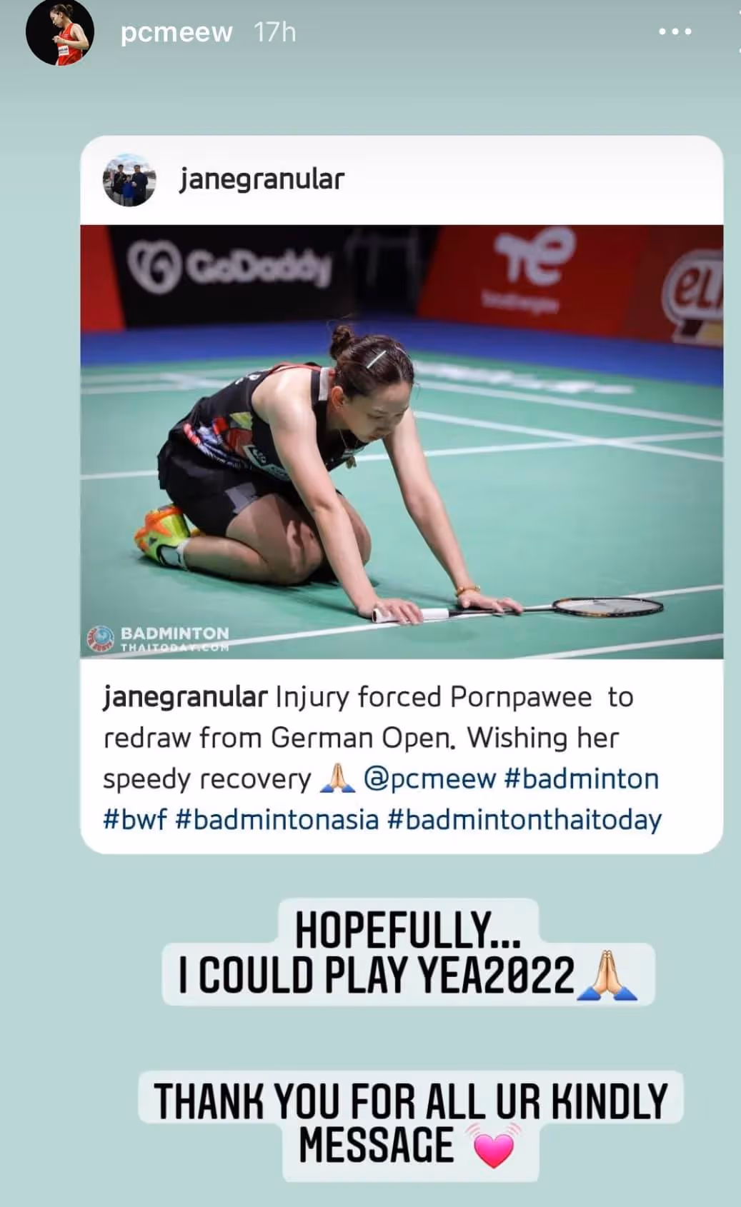 2022年3月7日,泰国女单李美妙宣布因伤退出德国公开赛!