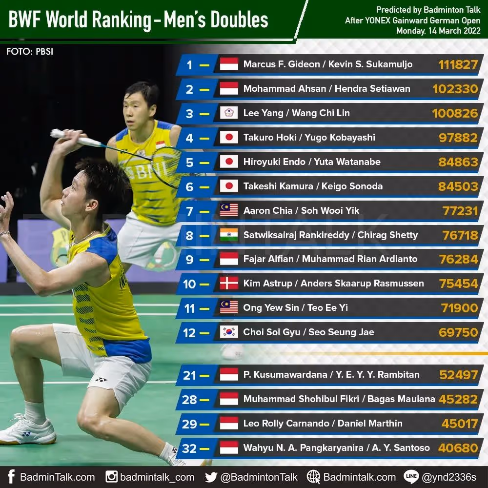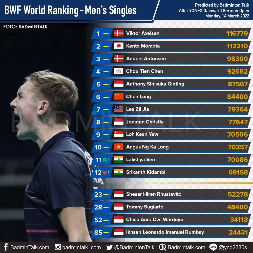 2022年德国羽球公开赛已落下帷幕,世界羽联更新世界排名,夺得德国赛男单亚军的叻斯亚一举超过斯里坎特成为印度一哥!国羽新组合皆拥有排名,刘雨辰/欧烜屹第264位!