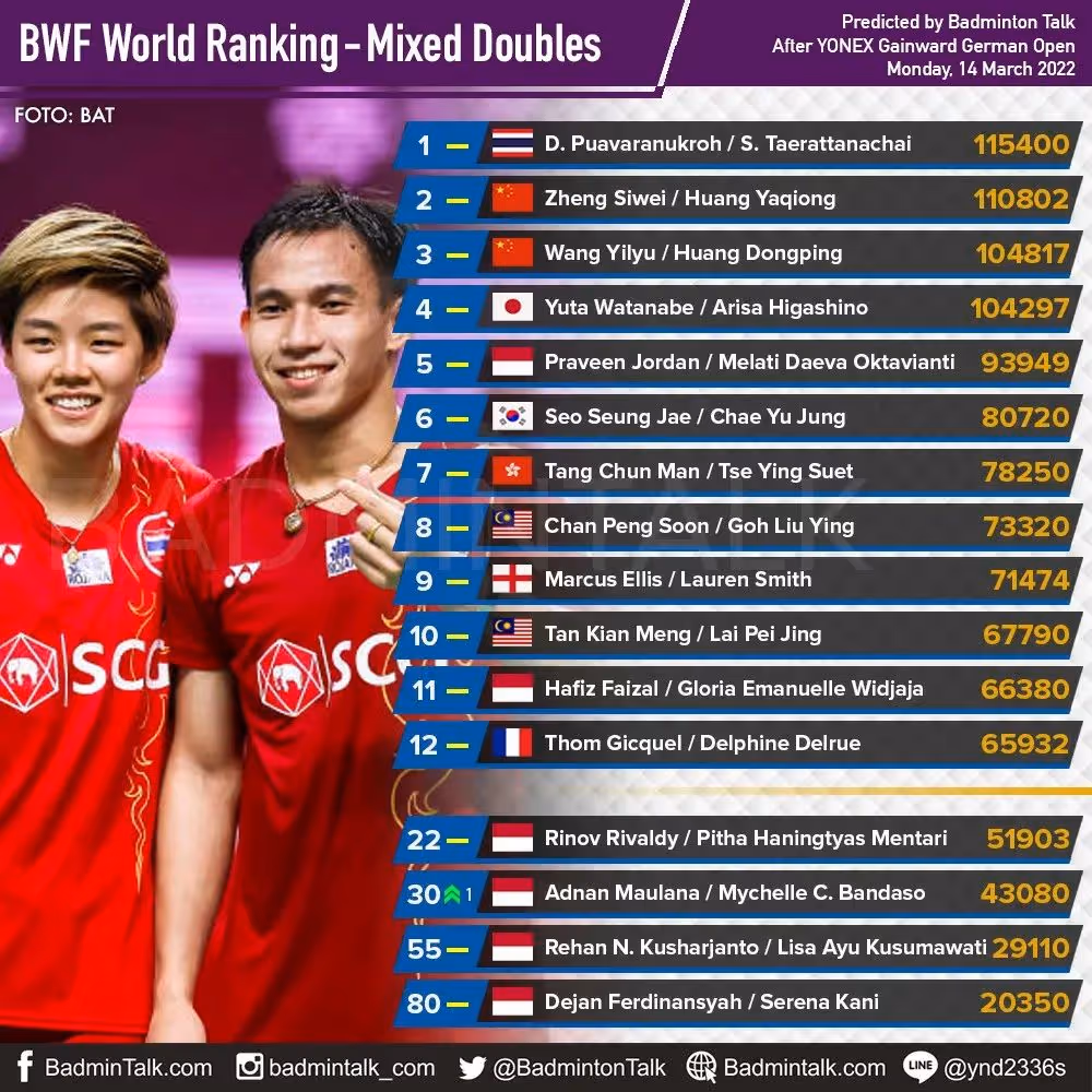 混双前十并无变化,国羽方面,新组合黄雅琼/欧烜屹排名第252位,郑思维/张殊贤第766位。