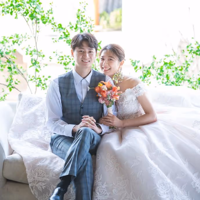 从照片中可以看到,金昭映身袭白色婚纱,手捧鲜花挽着老公张成浩的手臂,两人脸上都洋溢着甜蜜的微笑,坐在沙发上。