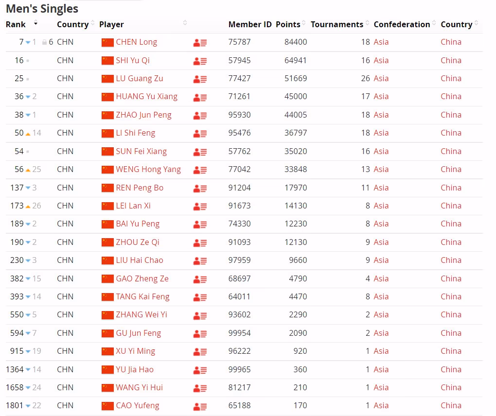 男单世界排名前20中,夺得亚锦赛男单冠军的李梓嘉超越国羽谌龙来到第6,其他并无变化。国羽方面谌龙下降1位至第7,李诗沣和翁泓阳分别上升14位和25位至第50和第56。石宇奇、陆光祖和孙飞翔并无变化,雷兰曦上升26位至第173。