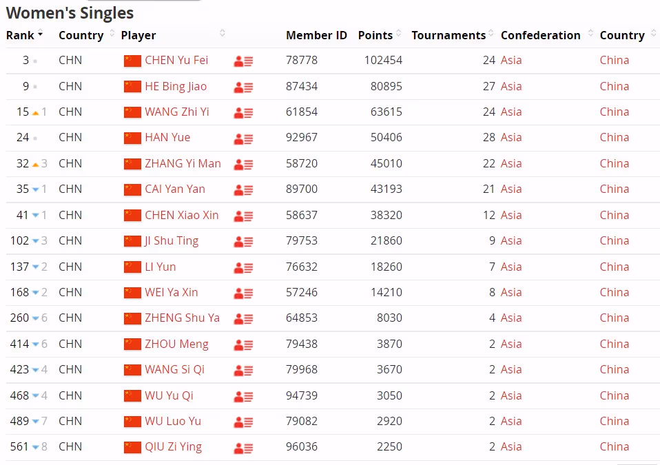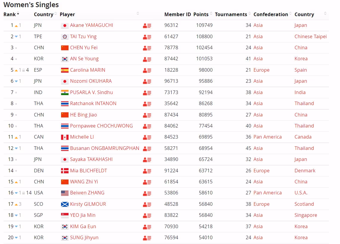 夺得亚锦赛亚军的山口茜一举超越戴资颖,以109749的高分位居榜首。重返赛场夺得欧锦赛女单冠军的马琳超越奥原希望上升1位至第5。国羽方面,夺得亚锦赛女单冠军的王祉怡上升1位至第15,张艺曼上升3位至第32;陈雨菲和韩悦并无变化。