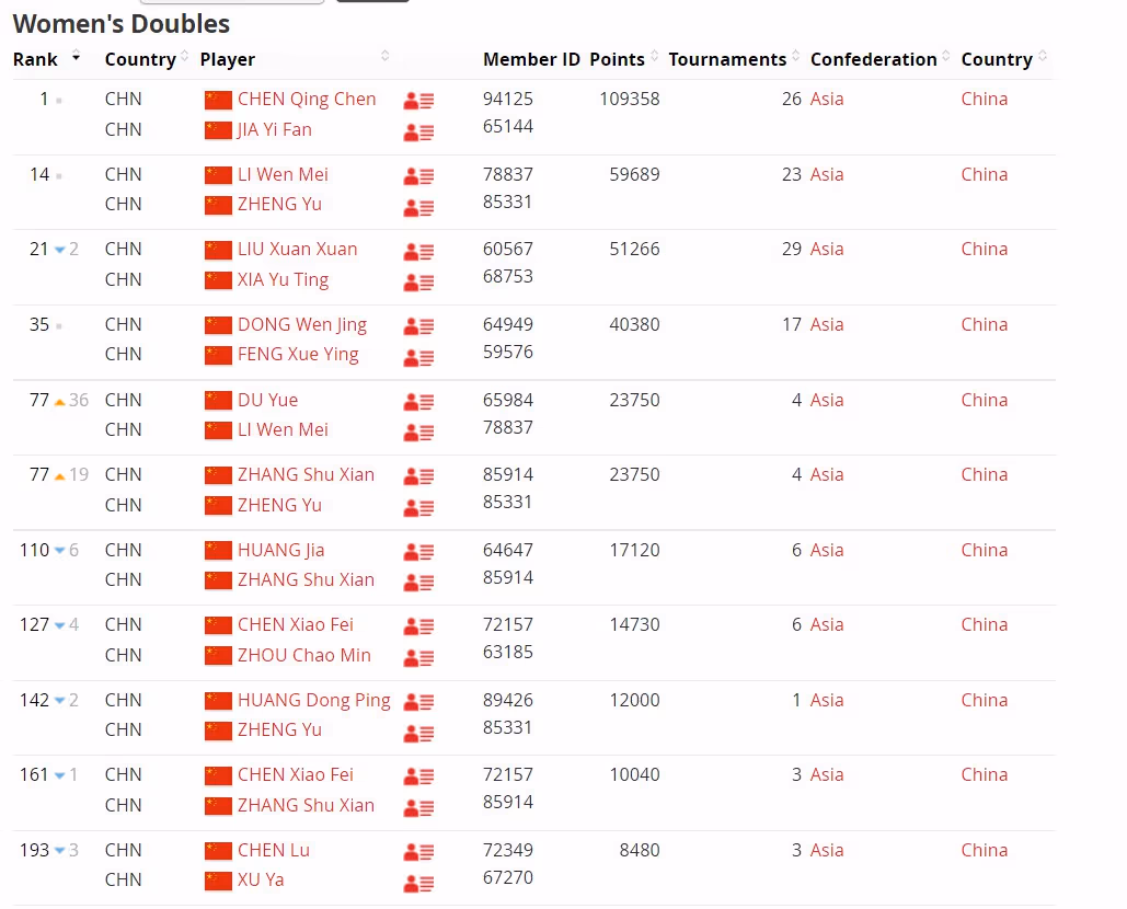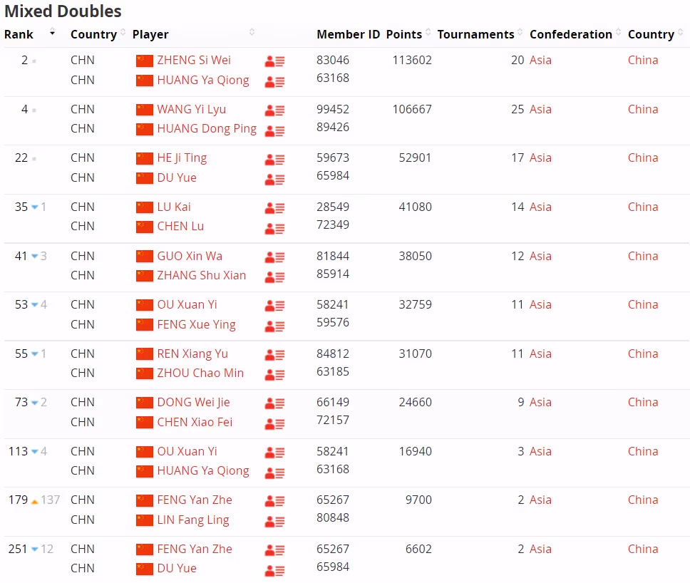 混双世界排名前十并无变化。国羽方面,郑思维/黄雅琼和王懿律/黄东萍并无变化,分别是第2和第4。参加亚锦赛止步16强的冯彦哲/林芳灵上升137位至第179。