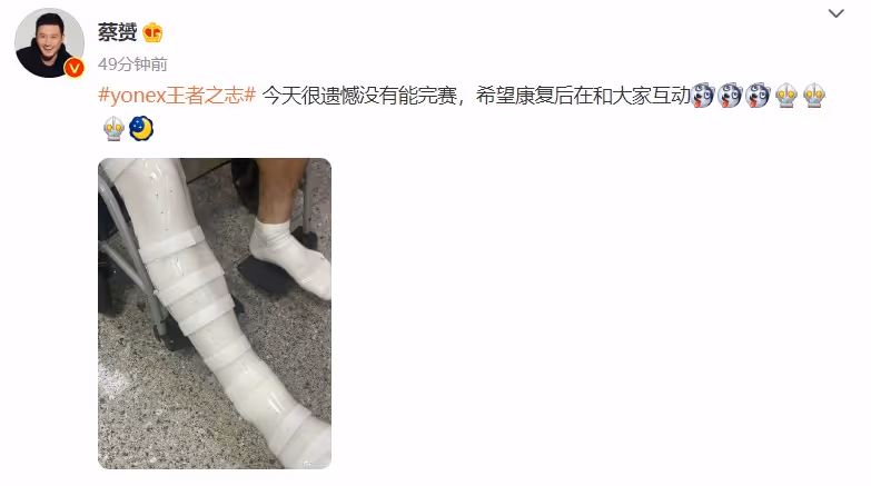2022年7月31日,中国羽毛球队前男双名将蔡赟在王者之志沈阳站的表演赛中疑似跟腱断裂。