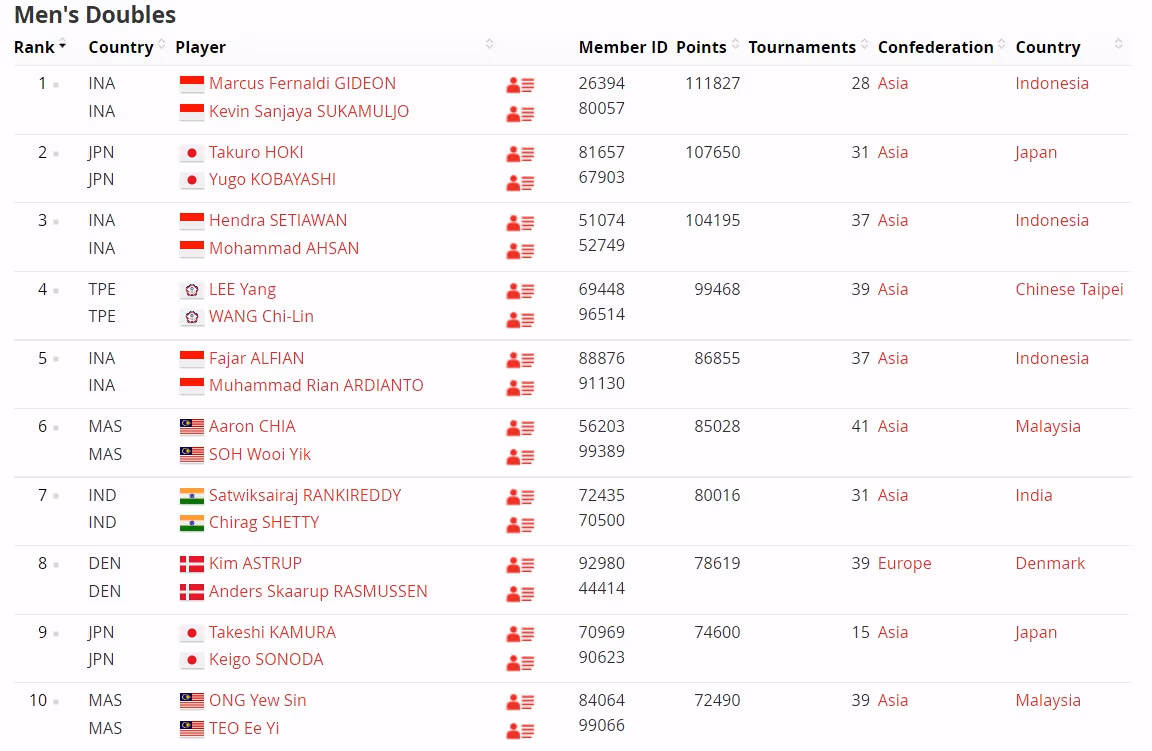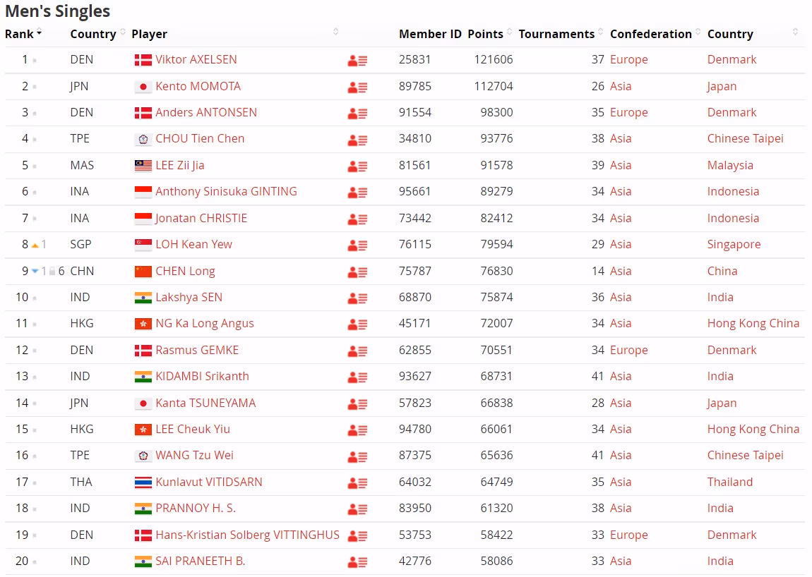 男单世界排名前20中,安赛龙依然位列榜一,其次是桃田贤斗。安东森、周天成、李梓嘉、金廷和乔纳坦分列三到七名,新加坡新科世界冠军骆建佑则超越了谌龙,排名第八。印度新星拉卡什亚排名第十位。