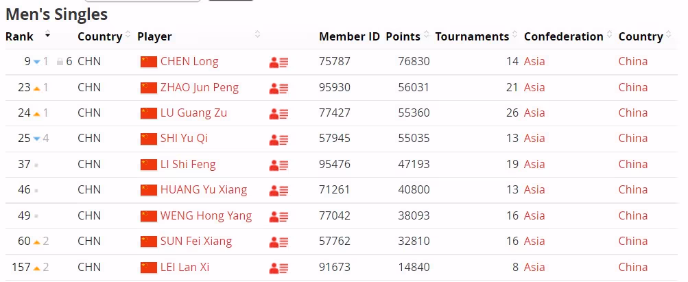国羽男单方面,谌龙和石宇奇排名继续下跌,分别位列第9和第25。赵俊鹏上升1位至第23,陆光祖上升1位至第24,孙飞翔上升2位至第60。李诗沣第37、翁泓阳第49。