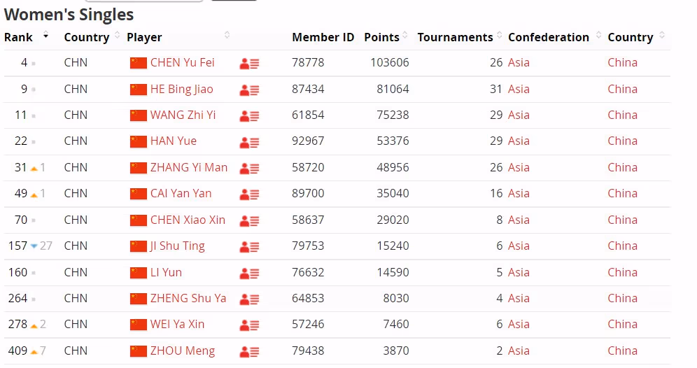 国羽女单方面,没有太大变化,陈雨菲第4、何冰娇第9、王祉怡第11、韩悦第22、张艺曼上升1位至第31。