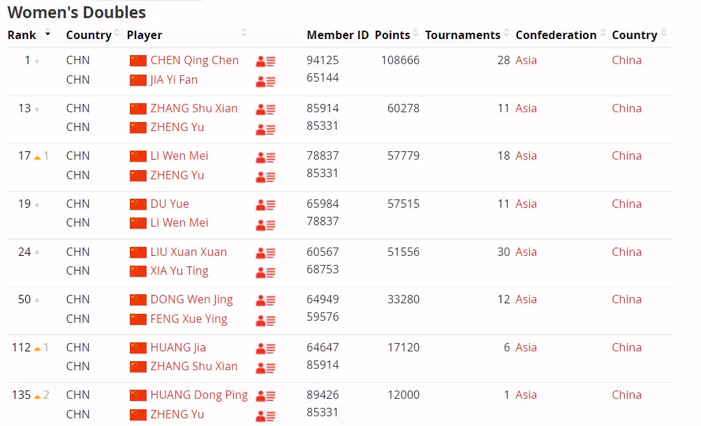 国羽女双陈清晨/贾一凡依然位列榜首,世界排名前十中并无变化。张殊贤/郑雨第13、杜玥/李汶妹第19、刘玄炫/夏玉婷下第24。
