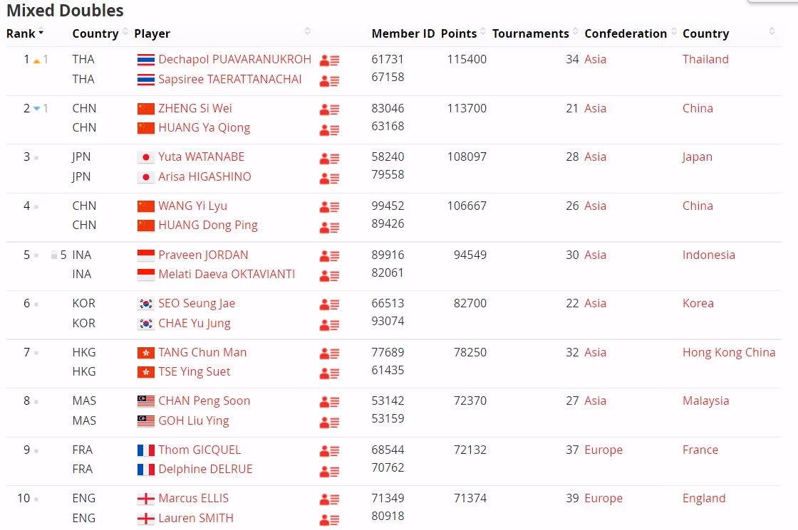 混双世界排名前十中,国羽雅思组合郑思维/黄雅琼被泰国组合德差波/沙西丽超越,降至第二但仅差1700分。黄鸭组合继续排名第四,郭新娃/张殊贤第32,冯彦哲/林芳灵第122。