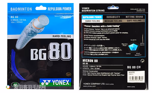 这些特性在球线上反映出来的性能就是:保磅性好、击球感硬、弹性好,在大力杀球时效果极佳,拥有一流的弹性,但同时也比较震手。而BG80的另一特点是它的线衣,这种椭圆形的纤维相比普通纤维更粗一些,特殊的椭圆形状造就了其粗糙的表面,使80线的击球硬度更高、触球时的摩擦力也更大。由于80线的线衣这些特性,在实际使用中,80线的耐用度并不高。
