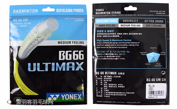 BG66UM的线径是0.65mm,以前曾是尤尼克斯最细的拍线,林丹、李宗伟、陶菲克、桃田贤斗等都曾钟爱这款。其弹性在众多球线当中也是属于领先的,而特有的ultimax涂层更是让球线的击球音变得更为尖锐,杀球时能够更为振奋人心,手感也是绝佳,而与这样的享受成正比的,是BG66UM极低的耐用度,对于击球点不准或者是力量较大的球友,这款球线常常是秒断,即便是正常磨损,球线寿命也短得可怜,土豪的话可随意使用。