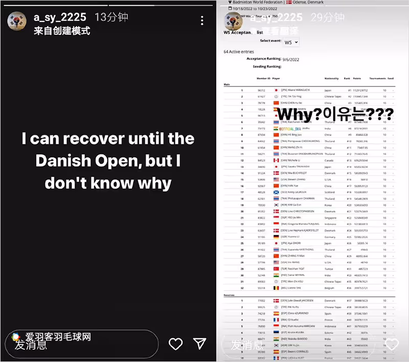 今年10月份将举行super750级别的丹麦、法国两站公开赛,但韩国羽协没有给安洗莹报名。安洗莹随后在个人社交平台连发两文质问,“为什么?”、“我能在丹麦公开赛之前恢复,为啥不给我报名?”也许安洗莹意识到这样发文不妥,就删除了这两条动态。但此事经过韩国国内外的媒体广泛报道后,韩国羽协遭到了大量球迷批评。