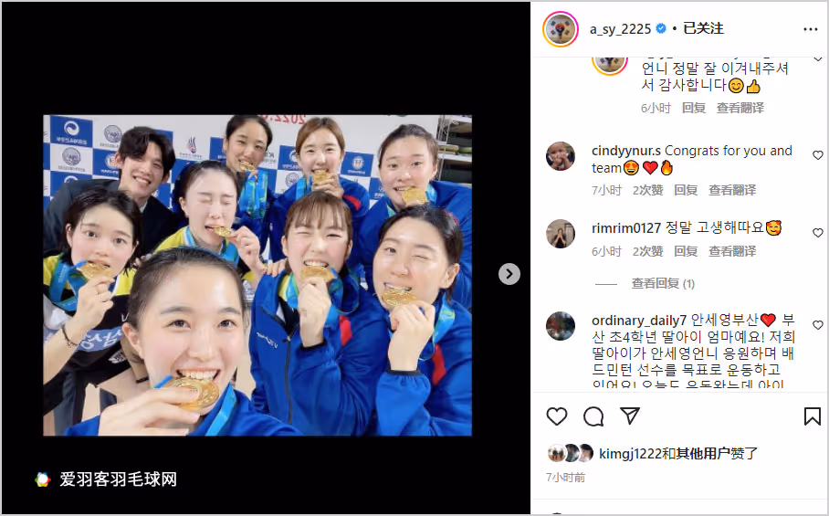 安洗莹10月5日在个人INS晒出所属俱乐部夺得全国冠军的照片、以及自己打比赛的照片,打脸韩国羽协。还有球迷去安洗莹的INS询问,安洗莹回答道:“真相终究会浮出水面”,看来这背后的水很深。有球迷称安洗莹是“韩版石宇奇”,也有球迷指出安洗莹在社交媒体发文得罪韩国羽协了。