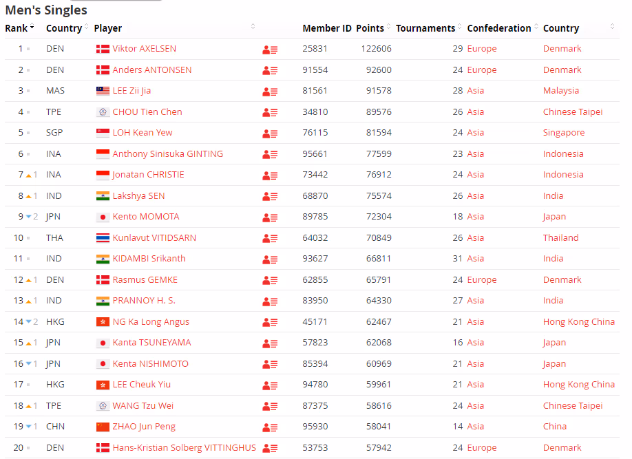 男单世界排名前20中,丹麦双雄安赛龙和安东森依然位踞第一和第二,大马一哥李梓嘉第三。乔纳坦、拉克什亚、格姆克、普拉诺、常山干太和王子维皆上升1位分别至第7、第8、第12、第13、第15和第18。日本名将桃田贤斗继续下滑至第9,伍家朗下降2位至第14,西本拳太和赵俊鹏皆下降1位分别至第16和第19,其他并无变化。