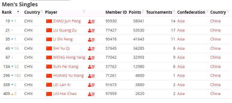 国羽男单方面,陆光祖第21、翁泓阳47,李诗沣下降1位至第35、石宇奇下降16位至第43、孙飞翔下降32位至第134、雷兰曦下降2位至第338,刘海超上升2位至第409。