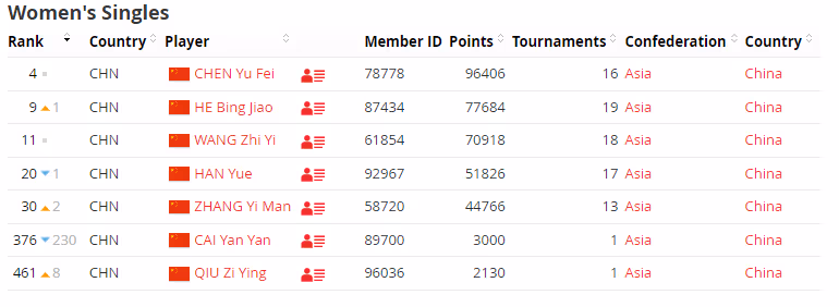 国羽女单方面,陈雨菲第4、王祉怡第11,张艺曼上升2位至第30,裘子莹上升8位至第461。