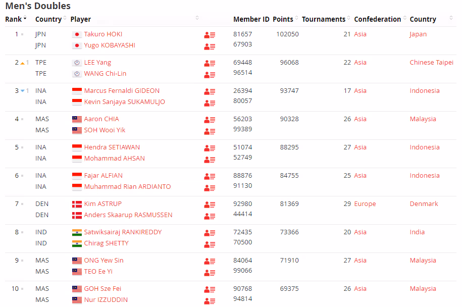 男双世界排名前10中,李洋/王齐麟上升1位至第2,费尔纳迪/苏卡穆约下降1位至第3,其他并无变化。