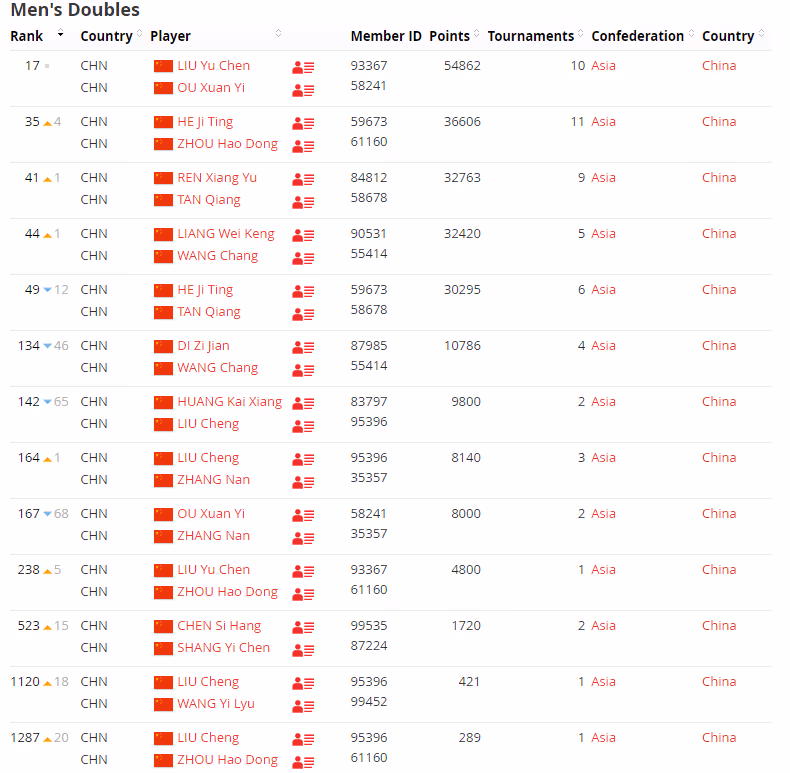 国羽男双方面,刘雨辰/欧烜屹第17,何济霆/周昊东上升4位至第35、任翔宇/谭强上升1位至第41、梁伟铿/王昶上升1位至第44、陈思航/商亦辰上升15位至第523。