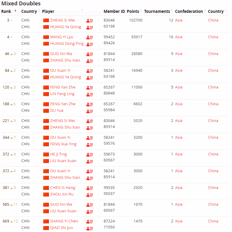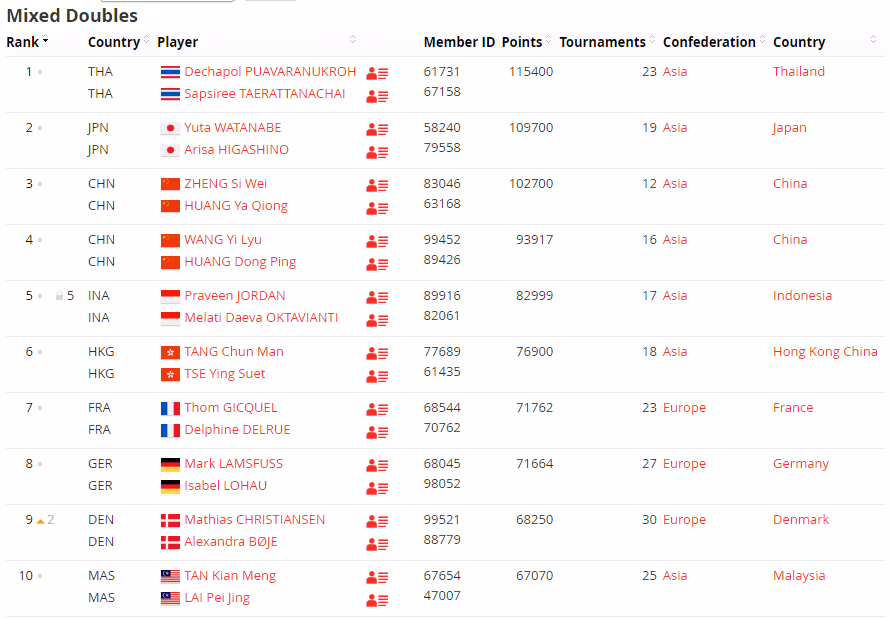 混双世界排名前10中,仅丹麦组合克里斯蒂安森/博尔上升2位至第9,其他并无变化。