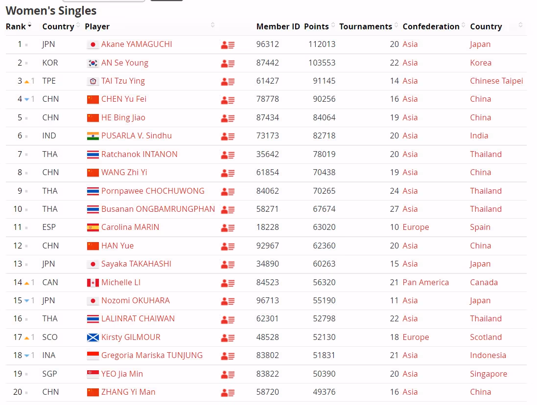 女单世界排名前20中,戴资颖、李文珊、和吉尔莫皆上升1位分别至第3、第14和第17;陈雨菲、奥原希望和玛莉丝卡皆下降1位分别至第4、第15和第18。