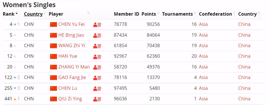 国羽女单方面,何冰娇第5、王祉怡第8、韩悦第12、张艺曼第20,高昉洁下降2位至第122、陈鲁下降3位至第255。