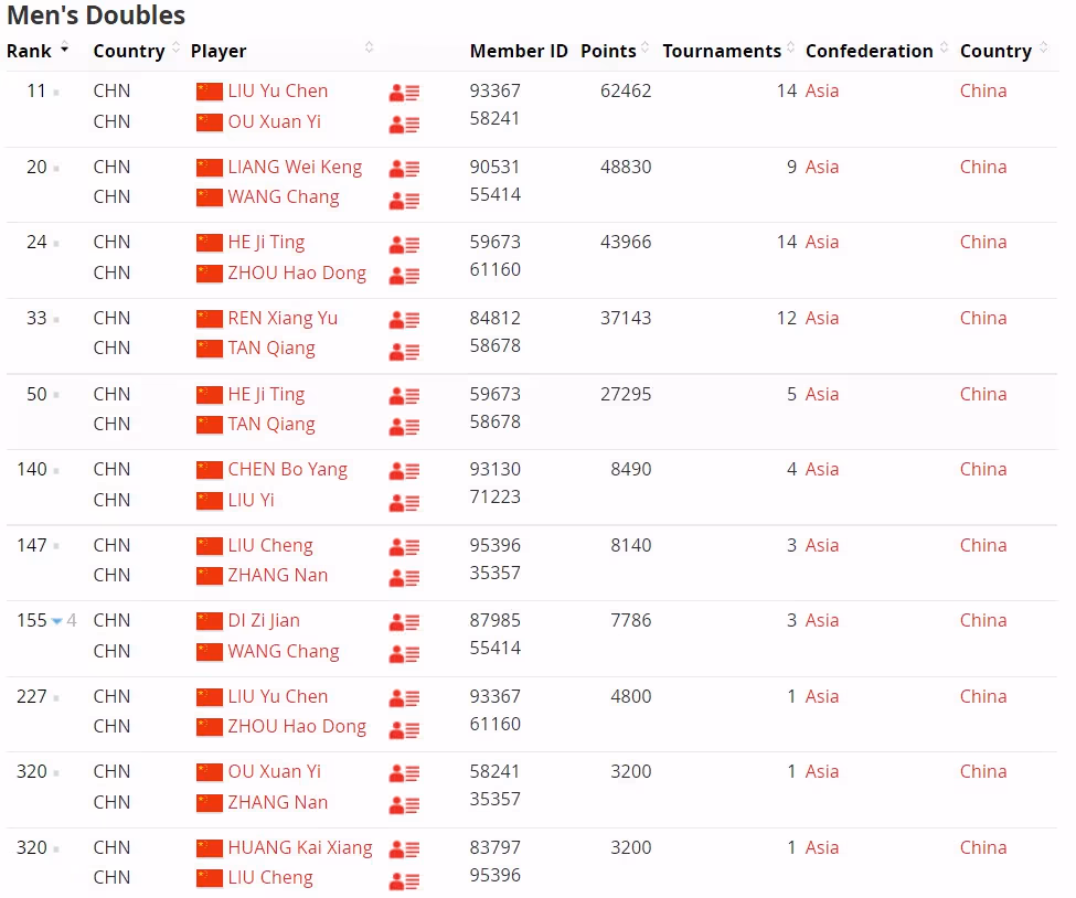 男双世界排名前10中,丹麦组合索伦森/安德斯和吴世飞/伊祖丁皆上升1位分别至第5和第9,阿山/萨蒂亚万和李洋/王齐麟皆下降1位分别至第6和第10。
